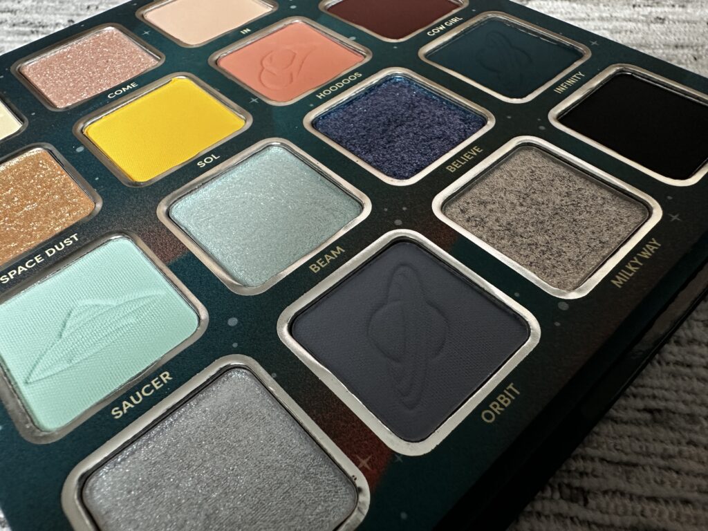 Ik moest heel sterk denken aan het ontwerp wat Oden’s Eye momenteel ook graag gebruikt. Een vierkante verpakking, van stevig karton, een zachte finish en een spiegel aan de binnenkant van de deksel. Op de achterkant van de sleeve staat eventuele relevante informatie. Ik vind de art work echt heel tof. Ze zegt zelf over het thema; de ruimte ontmoet western. Haar opdracht aan haar ontwerper was; ik wil een cowgirl zijn die ontvoerd wordt uit Texas. Dat is toch geniaal xD Het thema komt ook terug in het palette. Op verschillende kleuren is een afbeelding geprint die zeker connectie hebben met de verpakking.