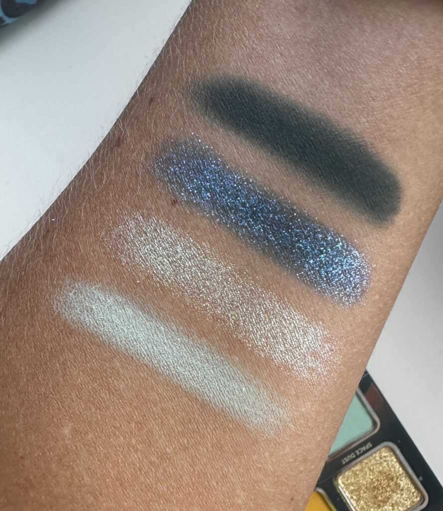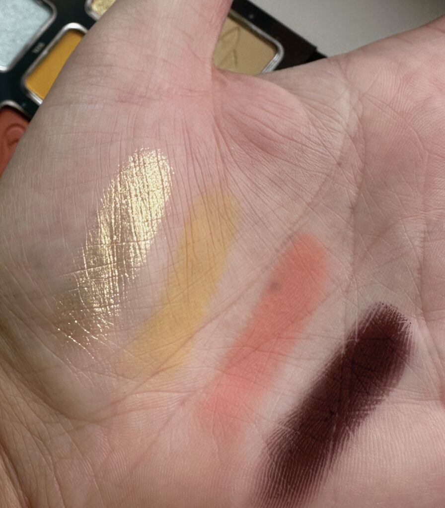 Vier rijen, van vier kleuren. Je ziet heel duidelijk de gradatie van donkere kleuren, naar lichtere kleuren. Er zitten vier verschillende donkere matte oogschaduws in, zodat je op verschillende manieren je look kan uitdiepen. Ik vind het ook heel bijzonder dat ze er direct duochrome oogschaduws in heeft gestopt. Het is zeker niet je standaard palette, waarmee je een neutrale alledaagse look mee maakt. Ik kom er echt nu achter, dat de eerste rij oogschaduws deze zin samen vormen: we come in peace. Echt heel erg leuk.