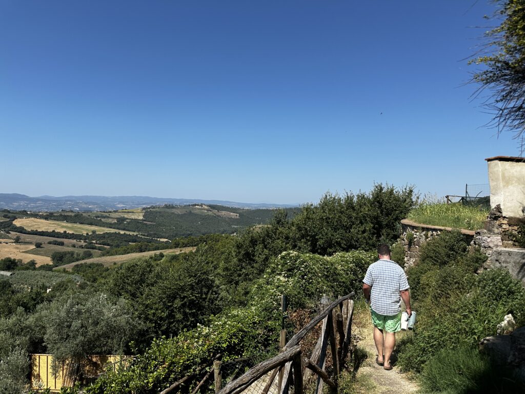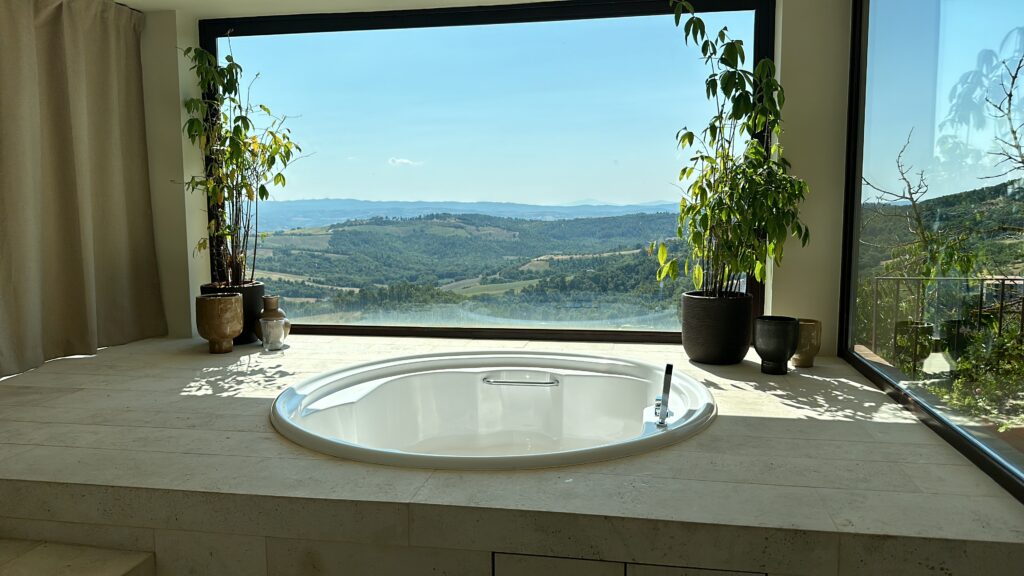 Ergens, tussen de groene heuvels van Umbrië, licht een dorp Saragano. Denk hierbij niet aan winkeltjes en straten. Nee, een handje vol oude huizen die allemaal tegen elkaar aan, op een heuvel staan, uitkijkend over een groen vallei. Het hotel Aethos Saragano, de kamers, zijn dus verspreid over dit dorpje. Wij zaten bijvoorbeeld met vier andere kamers (ongeveer) in een gebouw, maar het gebouw aan ons vast werd gewoon bewoond door locals. Voor een impressie hiervan is hun insta en eigen website echt een bezoek waard. Bij aankomst werden we geholpen met parkeren door een medewerker die net naar huis wilde gaan en doorverwezen naar de goede plek van de receptie. Daar checkte we in en werden we door een enorme gastvrije Italiaanse dame, naar onze kamer gebracht.