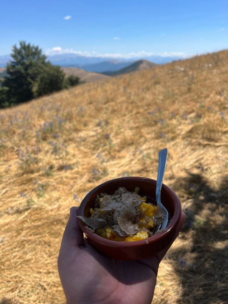 Na een tijdje rond te hebben gelopen door de bossen, gingen we de truffels wegen en brachten we een bezoek aan de herder bij de schaapskudde. Wat indrukwekkend. De schaapskudden wordt 24/7 bewaakt door honden met enorme spikes aan hun halsbanden. Waarom? Tegen de wolven. Elke week hebben ze honden een fysieke confrontatie met één of meerdere wolven. Ik was daar echt van onder de indruk! Op die plek kregen wij een tussendoortje, namelijk prosecco en roerei met verse truffel. Daar zat ik dan, midden op een heuvel, in Umbrië, tussen de honden en schapen, mijn roerei te eten met truffel en prosecco in de andere hand. Hoe kan je beter je verjaardag doorbrengen? Ik weet het niet.
