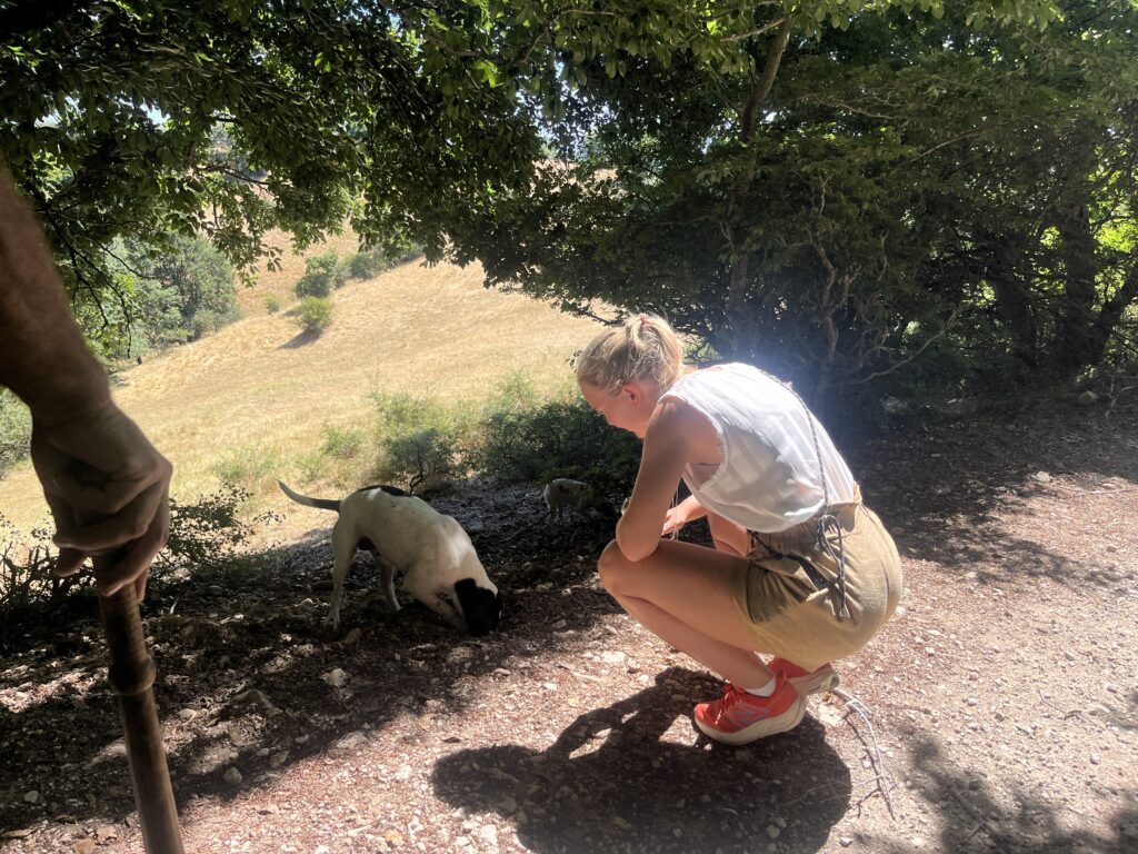 Met twee pick-ups gingen we omhoog, de bossen in. In de laadruimte wachtte drie honden ongeduldig op de aankomst in de bossen. Eenmaal boven, in de schaduw en veel meer koelte, werden de honden losgelaten. Truffeljacht wordt dus gedaan met honden. Deze honden ruiken de truffels, gaan graven, nemen de truffel in hun bek en brengen hem trots naar de ’truffeljager’. Als beloning krijgen ze een stukje van een biscuitje. Daarna rennen ze weer vrolijk weg, opzoek naar de volgende truffel. Geen grap, elke twee minuten werd er wel door één van de honden een truffel gebracht. Soms moesten we helpen, door te graven en dan is het ook echt zaak om de hond tegen te houden. Die zijn dan zo enthousiast, dat helpen erg lastig is.