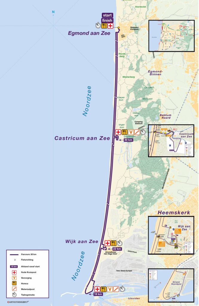 Op zaterdag is al het eerste event in Egmond aan Zee, namelijk het fietsen. Op de zaterdag wordt de Egmond-Pier-Egmond georganiseerd. Hier linksboven kan je de route zien van dit evenement. Het parcours is 38 km en gaat dus grotendeels over het strand. Ze fietsen van Egmond naar de pier bij Wijk aan Zee en dan weer terug naar Egmond. Jaarlijks een groot evenement wat dit jaar (2025) bijvoorbeeld Tom Dumoulin heeft getrokken. Hij nam deel aan het combinatieklassement. Dat houdt in dat hij Egmond-Pier-Egmond fietste en meeliep aan de Halve Marathon, voor een gecombineerde tijd.